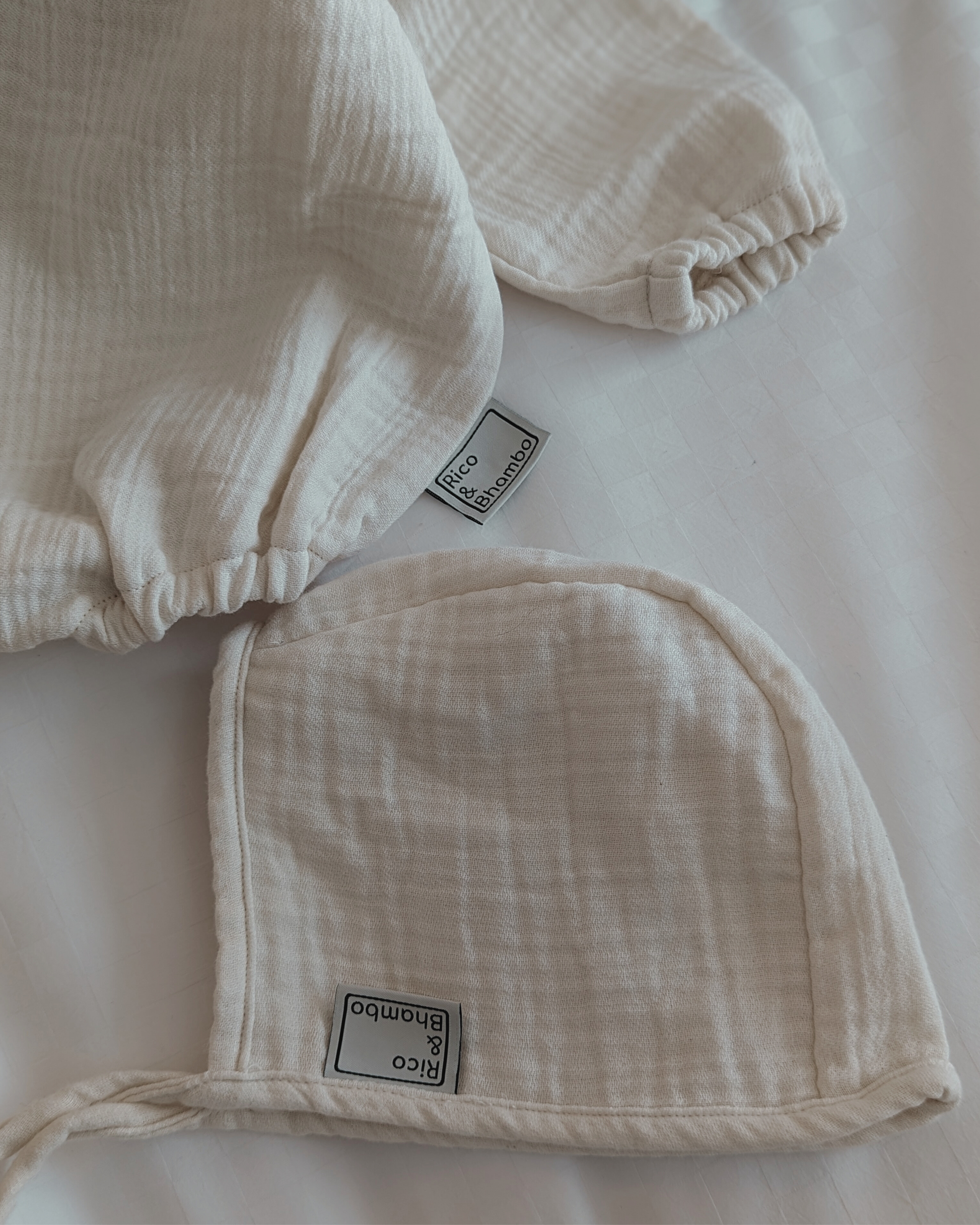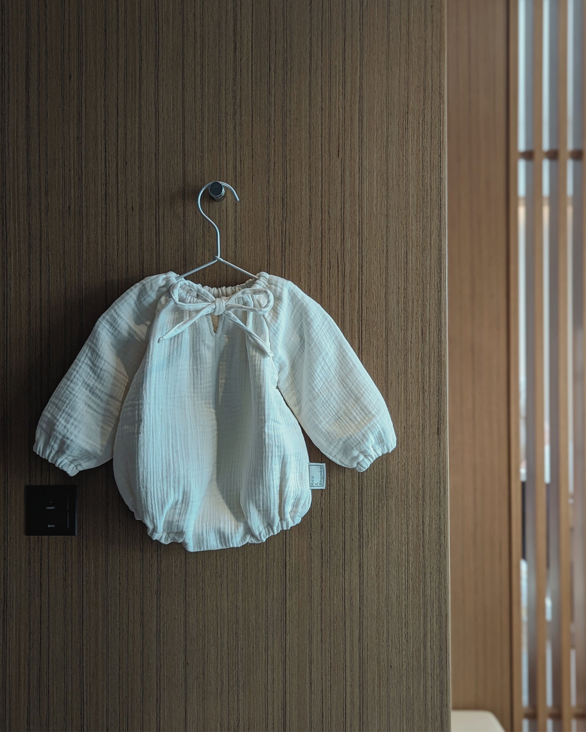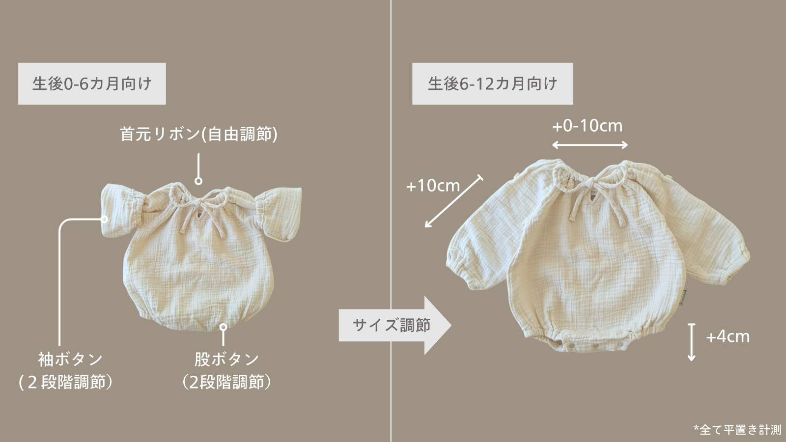 独自設計の"サイズ調節デザイン"を施し、生後0-12カ月頃まで着用可能なロンパース。国際認証取得のオーガニック100%国産生地を採用し、縫製は島根県出雲市の厳選された工場で行っています。新生児の退院着・セレモニードレスに始まり、ニューボーンフォト、お宮参り・お食い初め・1歳誕生日まで、節目のお祝いに着用いただけるデザインです。季節・サイズを気にせず着用いただけるため、出産祝いにもオススメ。