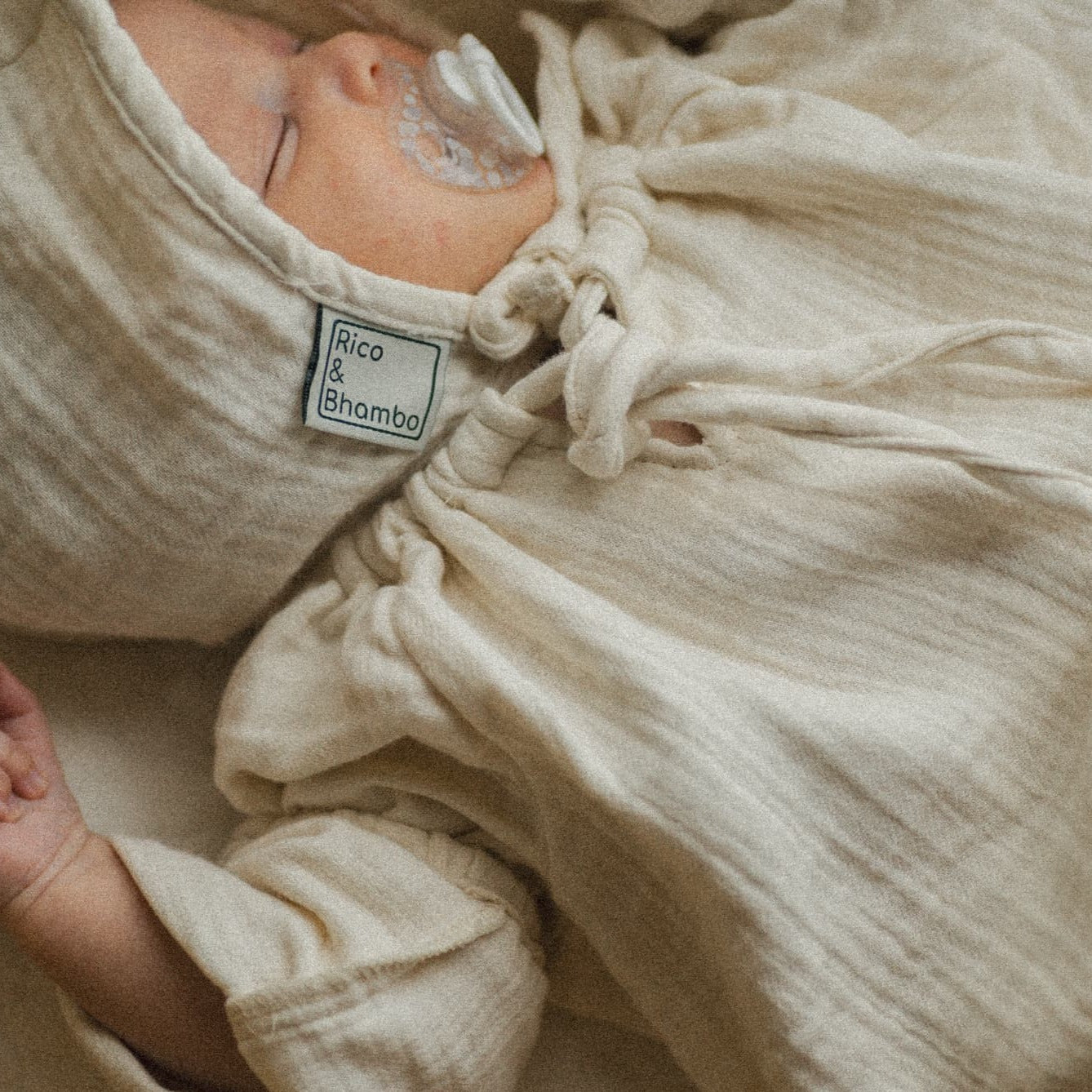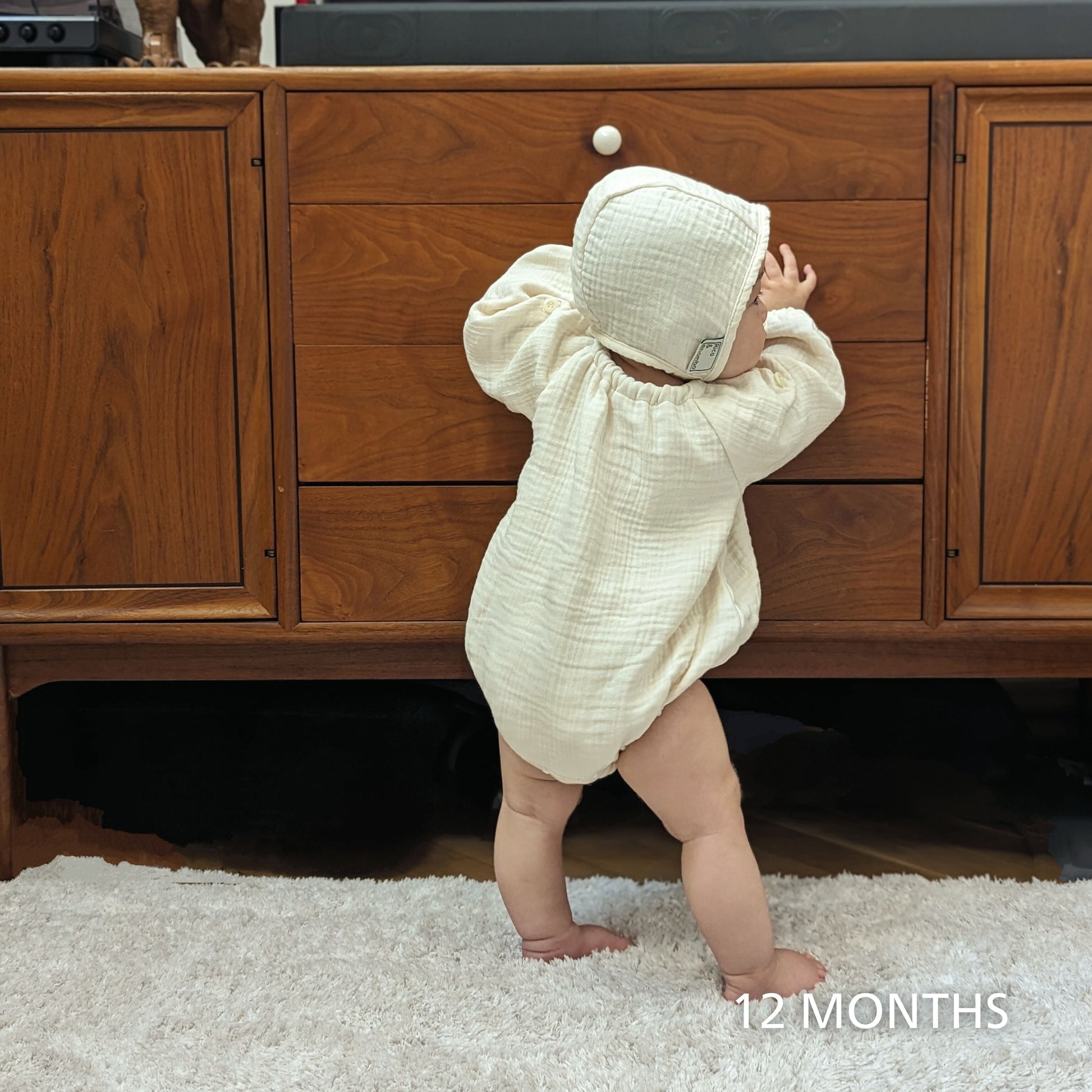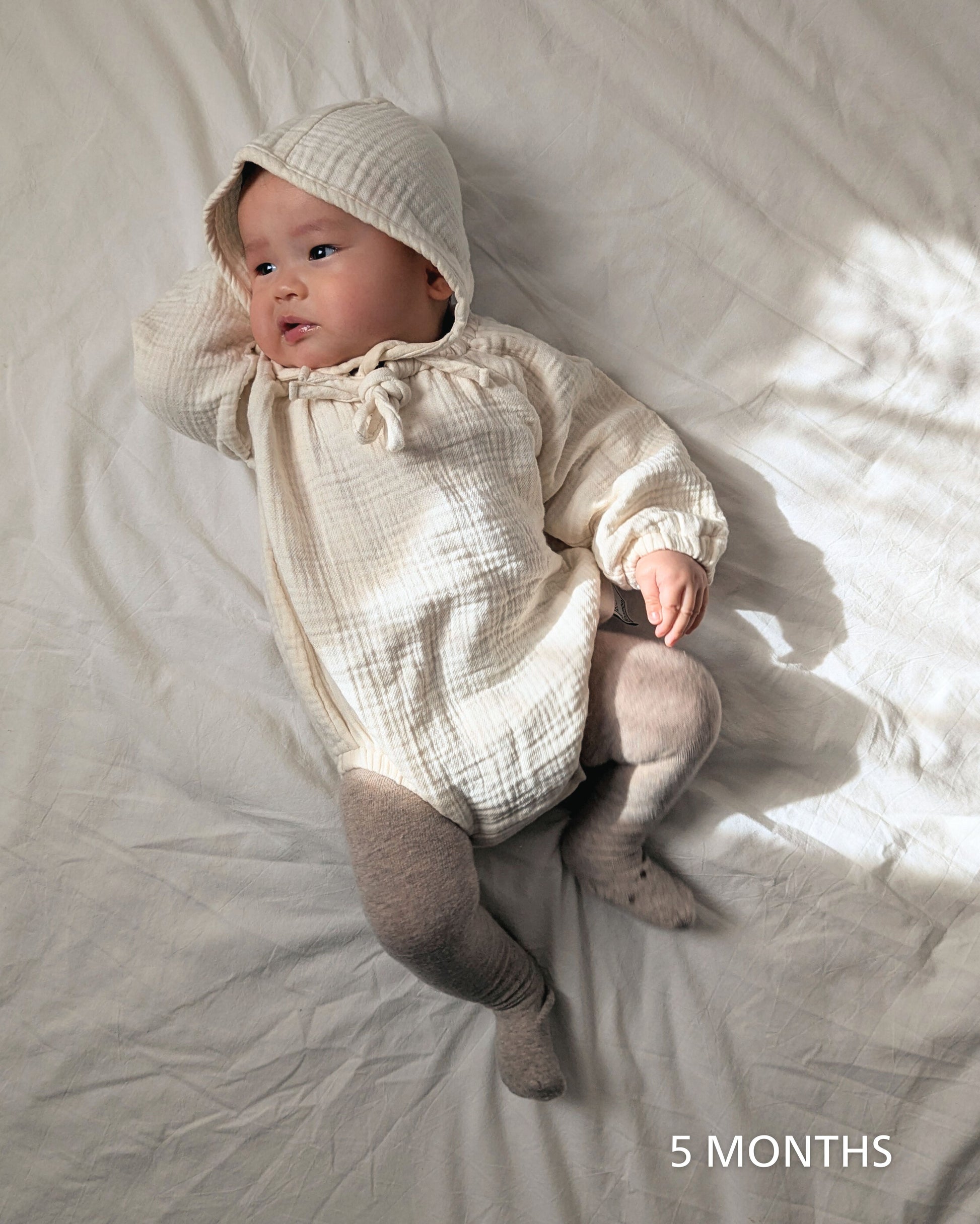 新生児はボタン留めでロールアップされたコロンとした形の袖。生後6ヶ月以降では長袖にしてふんわりと。暑い時期は敢えてロールアップして温度調整も可能です。